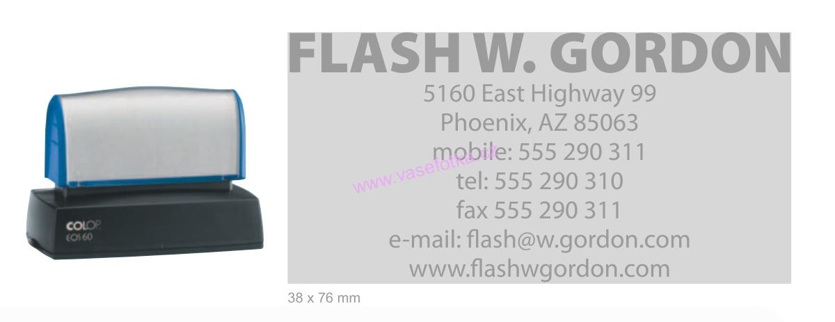 Plastové samobarvící razítko řady COLOP EOS - Flash technologie přímého tisku. Při objednání posíláme textovou i grafickou korekturu. Standardně se dodává v černé barvě tisku. Další možné barvy tisku je červená a modrá.
